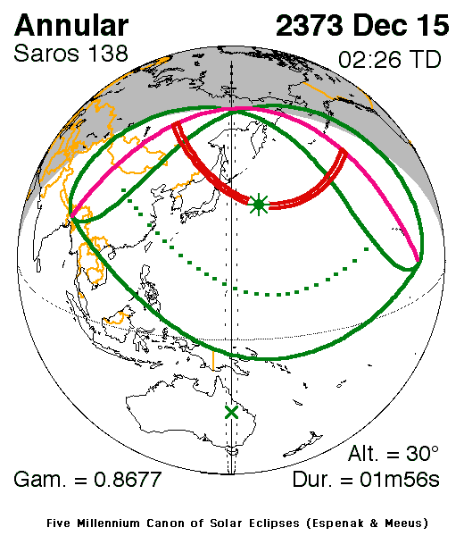 An annular eclipse of the Sun occurs on Saturday 15 December, 2373 UT, with maximum eclipse at 02:09 UT. A large annular eclipse will cover 98% of the Sun, creating a dramatic spectacle for observers in a path up to 141 km wide; it will last 1 minute and 56 seconds at the point of maximum eclipse.