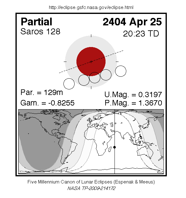 A partial eclipse of the Moon occurs on Sunday 25 April, 2404 UT, with maximum eclipse at 20:05 UT. The Earth's shadow on the moon will be clearly visible in this eclipse, with 32% of the Moon in shadow; the partial eclipse will last for 2 hours and 9 minutes.