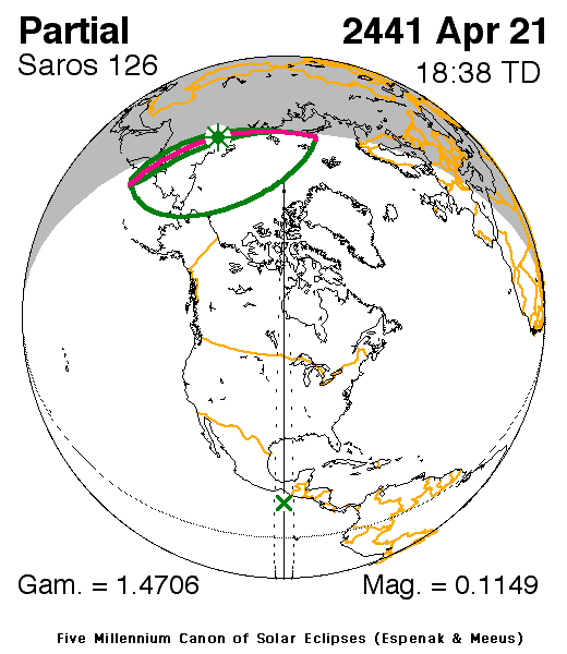 A partial eclipse of the Sun occurs on Sunday 21 April, 2441 UT, with maximum eclipse at 18:17 UT. With only 11% of the Sun covered at maximum eclipse, this will be a very marginal eclipse at best, and rather uninteresting.