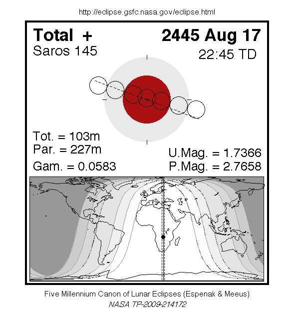A total eclipse of the Moon occurs on Thursday 17 August, 2445 UT, with maximum eclipse at 22:24 UT. A dramatic total eclipse lasting 1 hour and 43 minutes will plunge the full Moon into deep darkness, as it passes right through the centre of the Earth's umbral shadow. While the visual effect of a total eclipse is variable, the Moon may be stained a deep orange or red colour at maximum eclipse. This will be a great spectacle for everyone who sees it. The partial eclipse will last for 3 hours and 47 minutes in total.