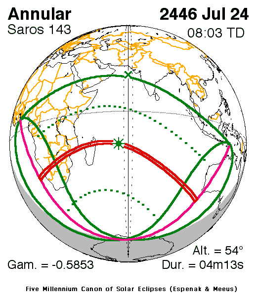 An annular eclipse of the Sun occurs on Tuesday 24 July, 2446 UT, with maximum eclipse at 07:42 UT. The Sun will be 97% covered in a moderate annular eclipse, lasting 4 minutes and 13 seconds and covering a path up to 149 km wide.