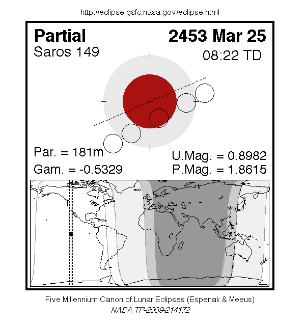 A partial eclipse of the Moon occurs on Tuesday 25 March, 2453 UT, with maximum eclipse at 08:00 UT. The Moon will be strikingly shadowed in this deep partial eclipse lasting 3 hours and 1 minute, with 90% of the Moon in darkness at maximum.