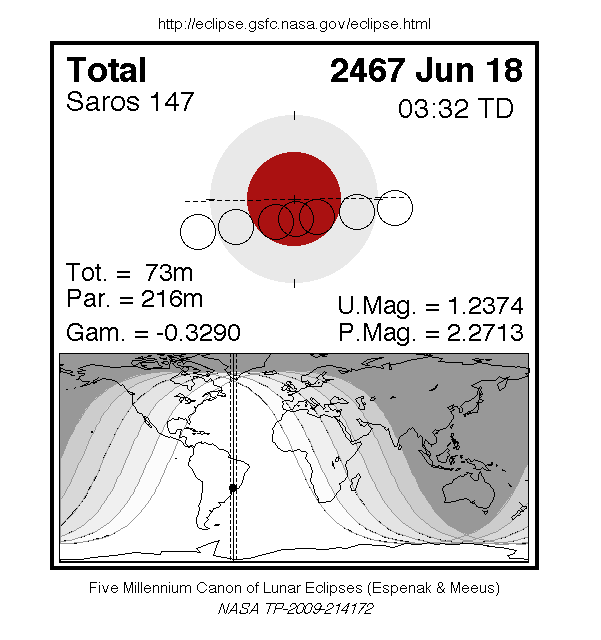 A total eclipse of the Moon occurs on Saturday 18 June, 2467 UT, with maximum eclipse at 03:09 UT. The Moon will be plunged into darkness for 1 hour and 13 minutes, in a deep total eclipse which will see the Moon 24% of its diameter inside the Earth's umbral shadow. The visual effect of this depends on the state of the Earth's atmosphere, but the Moon may be stained a deep red colour. The partial eclipse will last for 3 hours and 36 minutes in total.