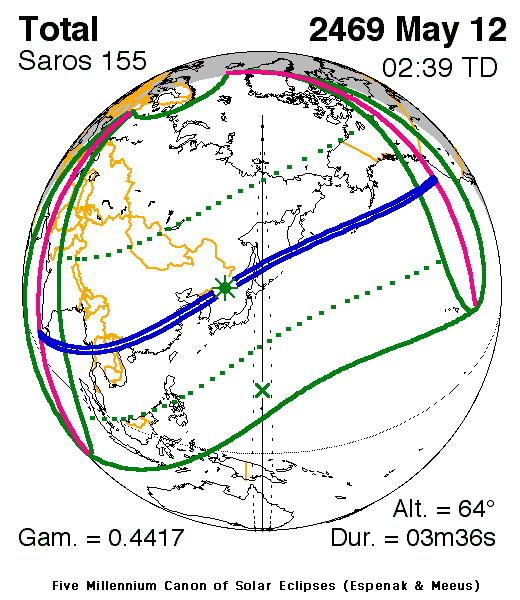 A total eclipse of the Sun occurs on Sunday 12 May, 2469 UT, with maximum eclipse at 02:17 UT. A dramatic total eclipse will plunge the Sun into darkness for 3 minutes and 36 seconds at maximum, creating an amazing spectacle for observers in a broad path up to 172 km wide.