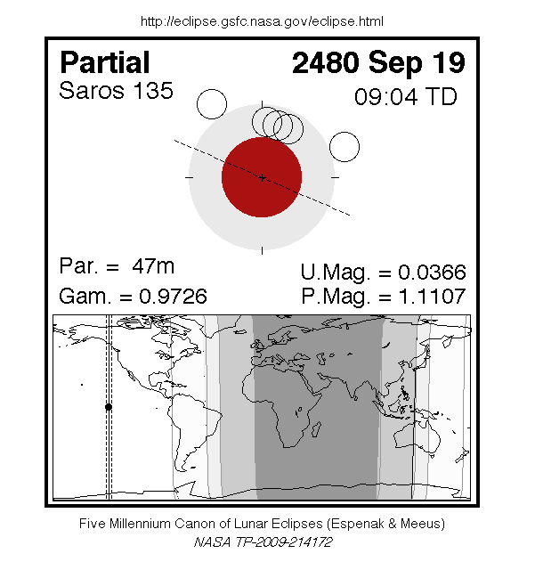 A partial eclipse of the Moon occurs on Thursday 19 September, 2480 UT, with maximum eclipse at 08:40 UT. A tiny bite out of the Moon may be visible at maximum, though just 4% of the Moon will be shadowed in a partial eclipse lasting for 46 minutes and 48 seconds. A shading across the moon from the Earth's penumbral shadow should be visible at maximum eclipse.