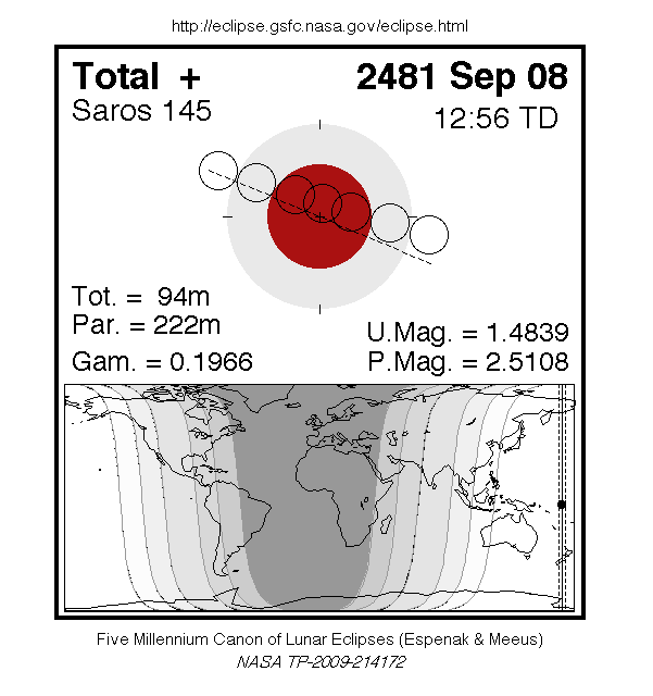 A total eclipse of the Moon occurs on Monday 8 September, 2481 UT, with maximum eclipse at 12:33 UT. The Moon will be plunged into darkness for 1 hour and 34 minutes, in a deep total eclipse which will see the Moon 48% of its diameter inside the Earth's umbral shadow. The visual effect of this depends on the state of the Earth's atmosphere, but the Moon may be stained a deep red colour. The partial eclipse will last for 3 hours and 42 minutes in total.