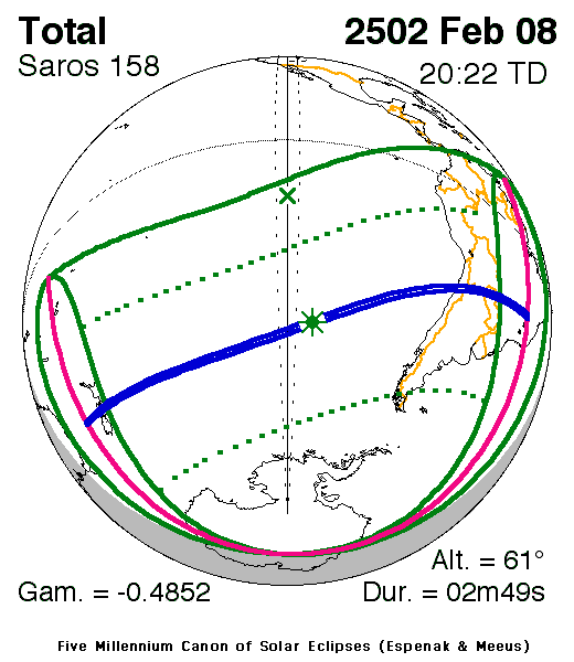A total eclipse of the Sun occurs on Wednesday 8 February, 2502 UT, with maximum eclipse at 19:58 UT. A dramatic total eclipse will plunge the Sun into darkness for 2 minutes and 49 seconds at maximum, creating an amazing spectacle for observers in a path up to 136 km wide.