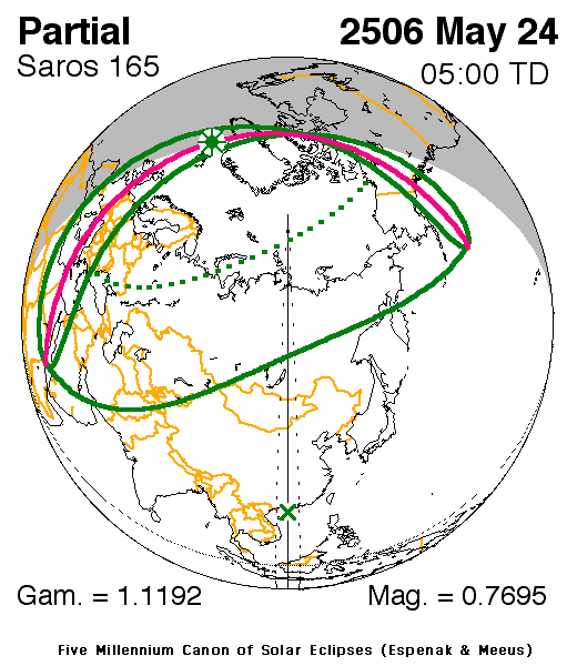 A partial eclipse of the Sun occurs on Monday 24 May, 2506 UT, with maximum eclipse at 04:34 UT. A moderate partial eclipse, with 77% of the Sun covered for viewers closest to the center, will create an interesting spectacle.