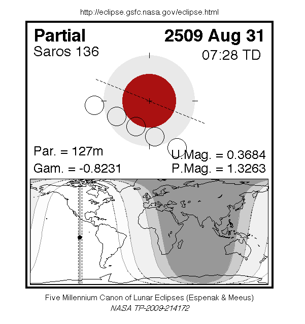 A partial eclipse of the Moon occurs on Saturday 31 August, 2509 UT, with maximum eclipse at 07:02 UT. The Earth's shadow on the moon will be clearly visible in this eclipse, with 37% of the Moon in shadow; the partial eclipse will last for 2 hours and 7 minutes.