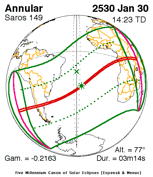 An annular eclipse of the Sun occurs on Monday 30 January, 2530 UT, with maximum eclipse at 13:56 UT. The Sun will be 97% covered in a moderate annular eclipse, lasting 3 minutes and 14 seconds and covering a path up to 119 km wide.