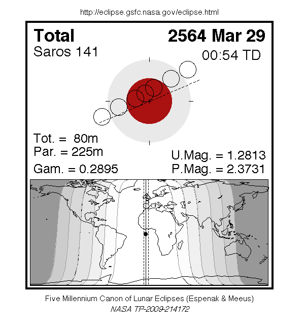 A total eclipse of the Moon occurs on Thursday 29 March, 2564 UT, with maximum eclipse at 00:24 UT. The Moon will be plunged into darkness for 1 hour and 20 minutes, in a deep total eclipse which will see the Moon 28% of its diameter inside the Earth's umbral shadow. The visual effect of this depends on the state of the Earth's atmosphere, but the Moon may be stained a deep red colour. The partial eclipse will last for 3 hours and 45 minutes in total.