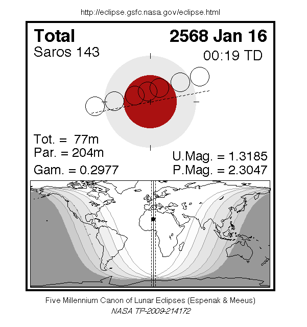 A total eclipse of the Moon occurs on Friday 15 January, 2568 UT, with maximum eclipse at 23:49 UT. The Moon will be plunged into darkness for 1 hour and 17 minutes, in a deep total eclipse which will see the Moon 32% of its diameter inside the Earth's umbral shadow. The visual effect of this depends on the state of the Earth's atmosphere, but the Moon may be stained a deep red colour. The partial eclipse will last for 3 hours and 24 minutes in total.