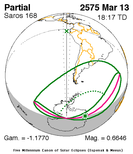 A partial eclipse of the Sun occurs on Monday 13 March, 2575 UT, with maximum eclipse at 17:47 UT. A moderate partial eclipse, with 66% of the Sun covered for viewers closest to the center, will create an interesting spectacle.