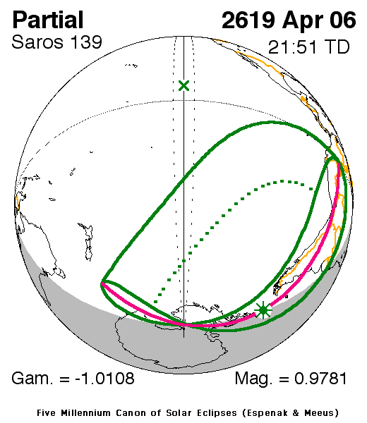 A partial eclipse of the Sun occurs on Tuesday 6 April, 2619 UT, with maximum eclipse at 21:17 UT. This will be a deep partial eclipse, with 98% of the Sun covered for viewers closest to the center. This will provide a significant spectacle for those who will see it.