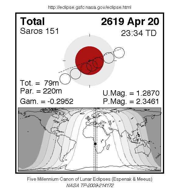 A total eclipse of the Moon occurs on Tuesday 20 April, 2619 UT, with maximum eclipse at 23:00 UT. The Moon will be plunged into darkness for 1 hour and 19 minutes, in a deep total eclipse which will see the Moon 29% of its diameter inside the Earth's umbral shadow. The visual effect of this depends on the state of the Earth's atmosphere, but the Moon may be stained a deep red colour. The partial eclipse will last for 3 hours and 40 minutes in total.