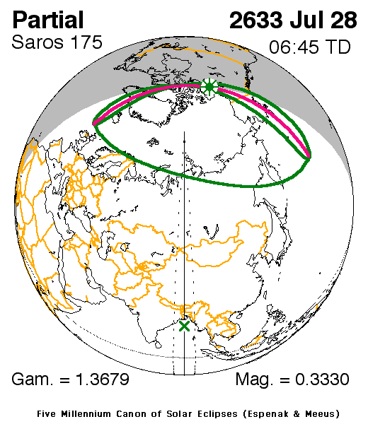 A partial eclipse of the Sun occurs on Sunday 28 July, 2633 UT, with maximum eclipse at 06:10 UT. A small partial eclipse will barely darken the Sun. With just 33% of the Sun covered for viewers closest to the center, this will be of limited interest.