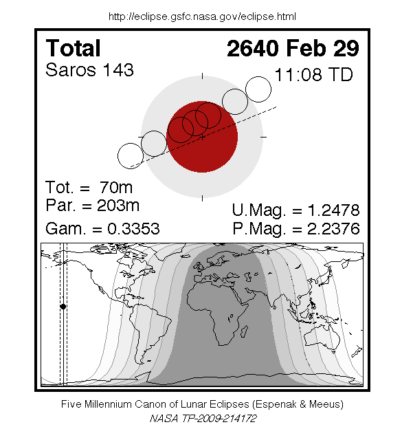 A total eclipse of the Moon occurs on Saturday 29 February, 2640 UT, with maximum eclipse at 10:32 UT. The Moon will be plunged into darkness for 1 hour and 10 minutes, in a deep total eclipse which will see the Moon 25% of its diameter inside the Earth's umbral shadow. The visual effect of this depends on the state of the Earth's atmosphere, but the Moon may be stained a deep red colour. The partial eclipse will last for 3 hours and 23 minutes in total.