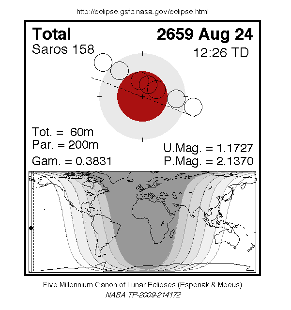 A total eclipse of the Moon occurs on Wednesday 24 August, 2659 UT, with maximum eclipse at 11:48 UT. A shallow total eclipse will see the Moon in relative darkness for 59 minutes and 54 seconds. The Moon will be 17% of its diameter into the Earth's umbral shadow, and should be significantly darkened. The partial eclipse will last for 3 hours and 20 minutes in total.