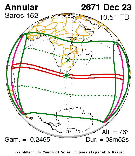 An annular eclipse of the Sun occurs on Saturday 23 December, 2671 UT, with maximum eclipse at 10:12 UT. A small annular eclipse will cover only 92% of the Sun in a very broad path, 294 km wide at maximum, and will last 8 minutes and 52 seconds.