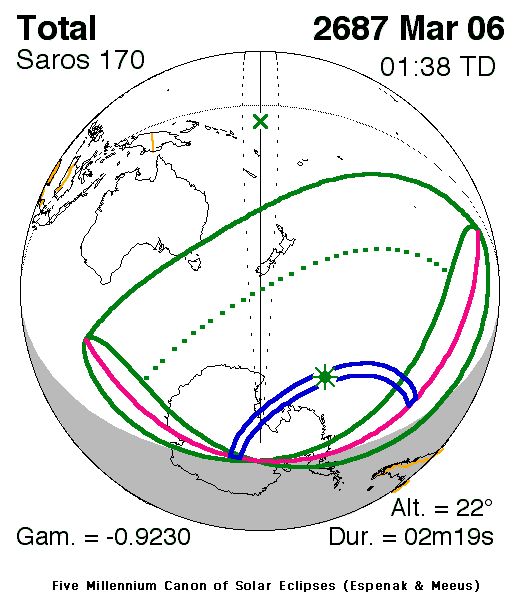 A total eclipse of the Sun occurs on Sunday 6 March, 2687 UT, with maximum eclipse at 00:58 UT. A dramatic total eclipse will plunge the Sun into darkness for 2 minutes and 19 seconds at maximum, creating an amazing spectacle for observers in a very broad path, 330 km wide at maximum.