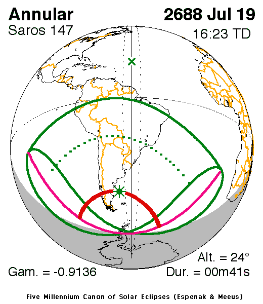 An annular eclipse of the Sun occurs on Thursday 19 July, 2688 UT, with maximum eclipse at 15:42 UT. A large annular eclipse will cover over 99% of the Sun, creating a dramatic spectacle for observers in a narrow path at most 64 km wide; it will last 41 seconds at the point of maximum eclipse.