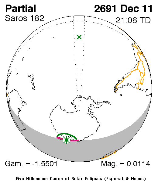 A partial eclipse of the Sun occurs on Friday 11 December, 2691 UT, with maximum eclipse at 20:25 UT. With only 1% of the Sun covered at maximum eclipse, this will be a very marginal eclipse at best, and rather uninteresting.