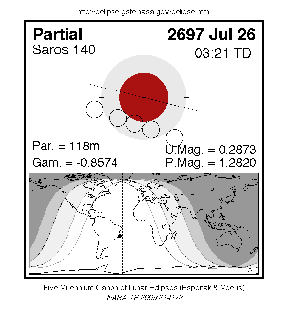 A partial eclipse of the Moon occurs on Monday 26 July, 2697 UT, with maximum eclipse at 02:40 UT. The Earth's shadow on the moon will be clearly visible in this eclipse, with 29% of the Moon in shadow; the partial eclipse will last for 1 hour and 58 minutes.