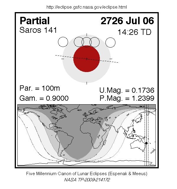 A partial eclipse of the Moon occurs on Tuesday 6 July, 2726 UT, with maximum eclipse at 13:42 UT. At maximum eclipse, a small bite out of the Moon should be visible. The eclipse will last for 1 hour and 40 minutes, with just 17% of the Moon in shadow at maximum.