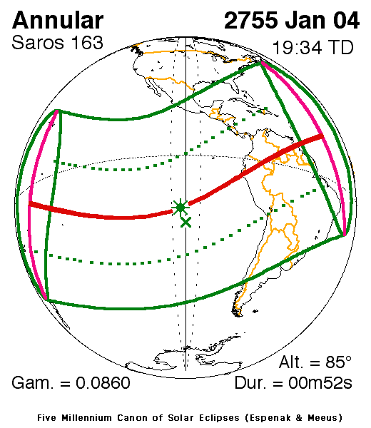 An annular eclipse of the Sun occurs on Tuesday 4 January, 2755 UT, with maximum eclipse at 18:47 UT. A large annular eclipse will cover over 99% of the Sun, creating a dramatic spectacle for observers in a narrow path at most 28 km wide; it will last 52 seconds at the point of maximum eclipse.