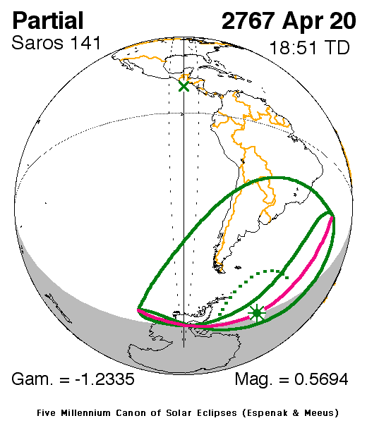 A partial eclipse of the Sun occurs on Thursday 20 April, 2767 UT, with maximum eclipse at 18:03 UT. A moderate partial eclipse, with 57% of the Sun covered for viewers closest to the center, will create an interesting spectacle.