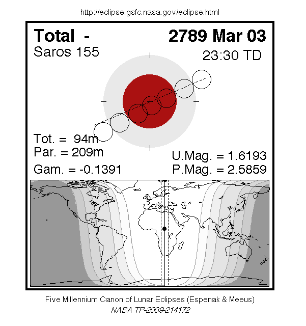 A total eclipse of the Moon occurs on Friday 3 March, 2789 UT, with maximum eclipse at 22:40 UT. A dramatic total eclipse lasting 1 hour and 34 minutes will plunge the full Moon into deep darkness, as it passes right through the centre of the Earth's umbral shadow. While the visual effect of a total eclipse is variable, the Moon may be stained a deep orange or red colour at maximum eclipse. This will be a great spectacle for everyone who sees it. The partial eclipse will last for 3 hours and 29 minutes in total.
