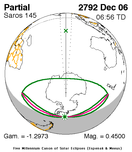 A partial eclipse of the Sun occurs on Sunday 6 December, 2792 UT, with maximum eclipse at 06:05 UT. A small partial eclipse will barely darken the Sun. With just 45% of the Sun covered for viewers closest to the center, this will be of limited interest.