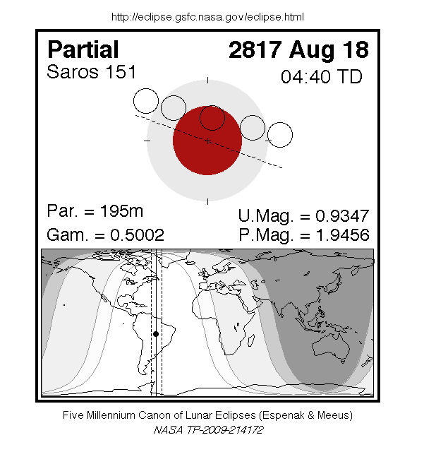 A partial eclipse of the Moon occurs on Friday 18 August, 2817 UT, with maximum eclipse at 03:47 UT. The Moon will be almost covered by the Earth's shadow in a very deep partial eclipse, lasting 3 hours and 15 minutes. With 93% of the Moon in shadow at maximum eclipse, this will be quite a memorable event.