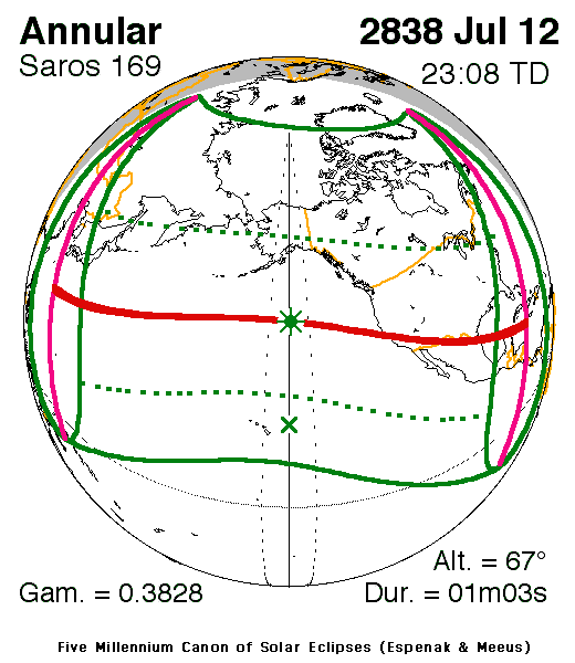 An annular eclipse of the Sun occurs on Monday 12 July, 2838 UT, with maximum eclipse at 22:13 UT. A large annular eclipse will cover 99% of the Sun, creating a dramatic spectacle for observers in a narrow path at most 42 km wide; it will last 1 minute and 3 seconds at the point of maximum eclipse.