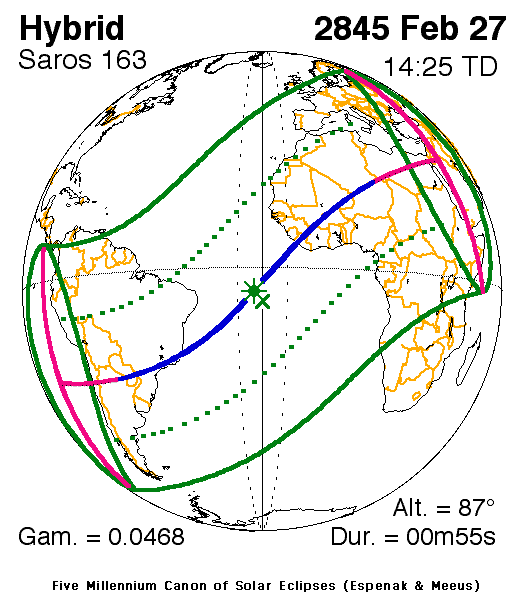 A hybrid eclipse of the Sun occurs on Monday 27 February, 2845 UT, with maximum eclipse at 13:29 UT. The Sun will be darkened for 55 seconds by a dramatic hybrid eclipse covering a narrow path at most 34 km wide. This will be a sight worth seeing.