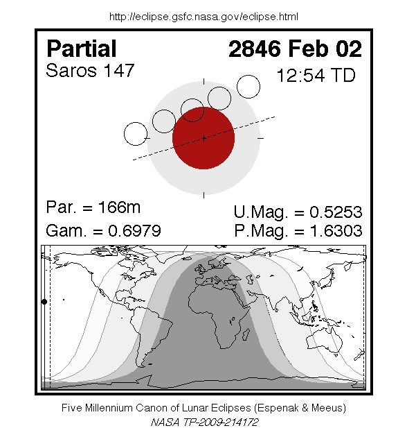 A partial eclipse of the Moon occurs on Friday 2 February, 2846 UT, with maximum eclipse at 11:58 UT. The Earth's shadow on the moon will be clearly visible in this eclipse, with 53% of the Moon in shadow; the partial eclipse will last for 2 hours and 46 minutes.