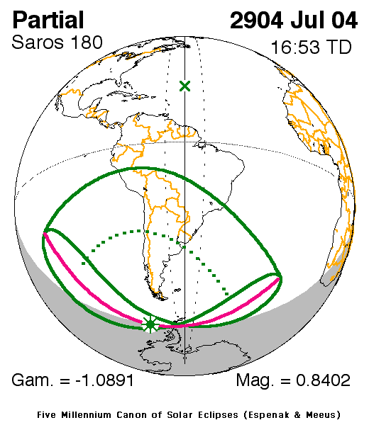 A partial eclipse of the Sun occurs on Friday 4 July, 2904 UT, with maximum eclipse at 15:50 UT. This will be a deep partial eclipse, with 84% of the Sun covered for viewers closest to the center. This will provide a significant spectacle for those who will see it.