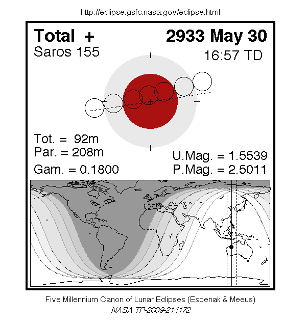 A total eclipse of the Moon occurs on Saturday 30 May, 2933 UT, with maximum eclipse at 15:51 UT. The Moon will be plunged into darkness for 1 hour and 32 minutes, in a deep total eclipse which will see the Moon 55% of its diameter inside the Earth's umbral shadow. The visual effect of this depends on the state of the Earth's atmosphere, but the Moon may be stained a deep red colour. The partial eclipse will last for 3 hours and 28 minutes in total.