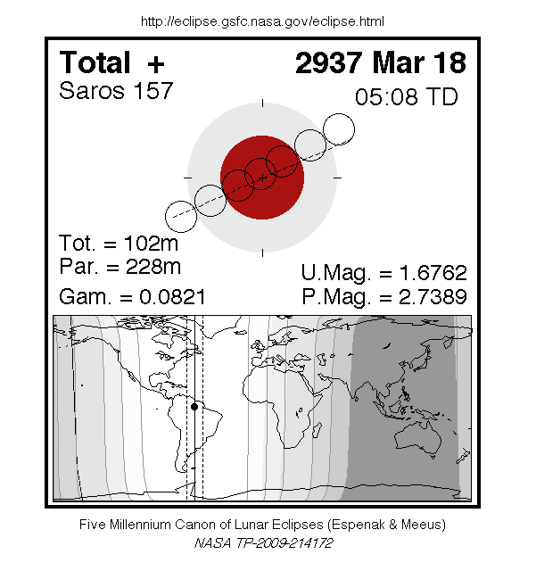 A total eclipse of the Moon occurs on Monday 18 March, 2937 UT, with maximum eclipse at 04:01 UT. A dramatic total eclipse lasting 1 hour and 42 minutes will plunge the full Moon into deep darkness, as it passes right through the centre of the Earth's umbral shadow. While the visual effect of a total eclipse is variable, the Moon may be stained a deep orange or red colour at maximum eclipse. This will be a great spectacle for everyone who sees it. The partial eclipse will last for 3 hours and 48 minutes in total.