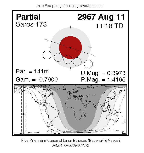 A partial eclipse of the Moon occurs on Tuesday 11 August, 2967 UT, with maximum eclipse at 10:08 UT. The Earth's shadow on the moon will be clearly visible in this eclipse, with 40% of the Moon in shadow; the partial eclipse will last for 2 hours and 21 minutes.