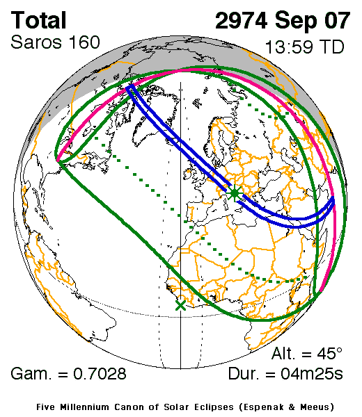 A total eclipse of the Sun occurs on Wednesday 7 September, 2974 UT, with maximum eclipse at 12:48 UT. A dramatic total eclipse will plunge the Sun into darkness for 4 minutes and 25 seconds at maximum, creating an amazing spectacle for observers in a very broad path, 289 km wide at maximum.