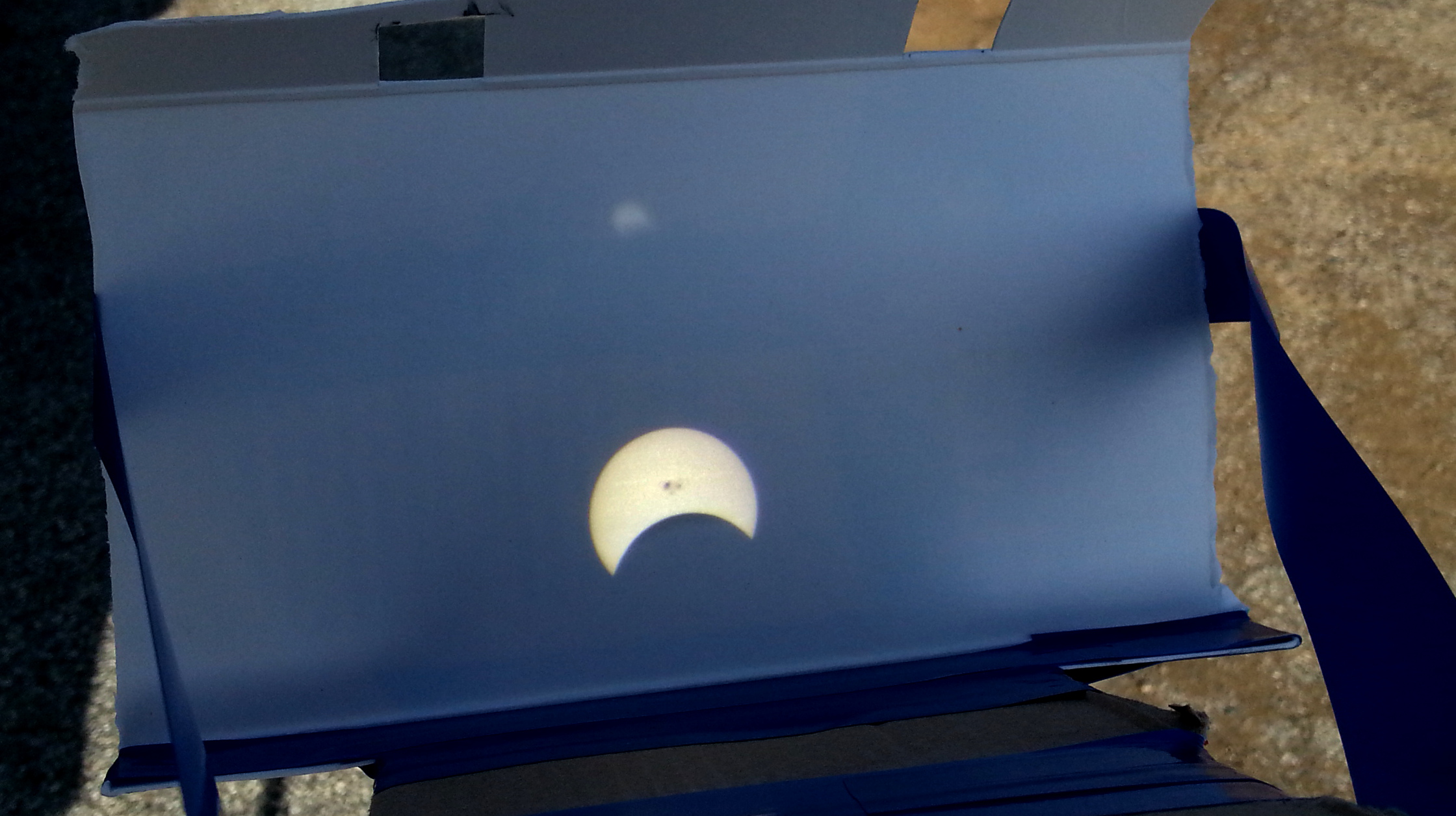 The partial solar eclipse of 23 Oct, 2014, as seen from Palo Alto, using a simple binocular-based eclipse projector. Active Region 2192 is clearly visible.