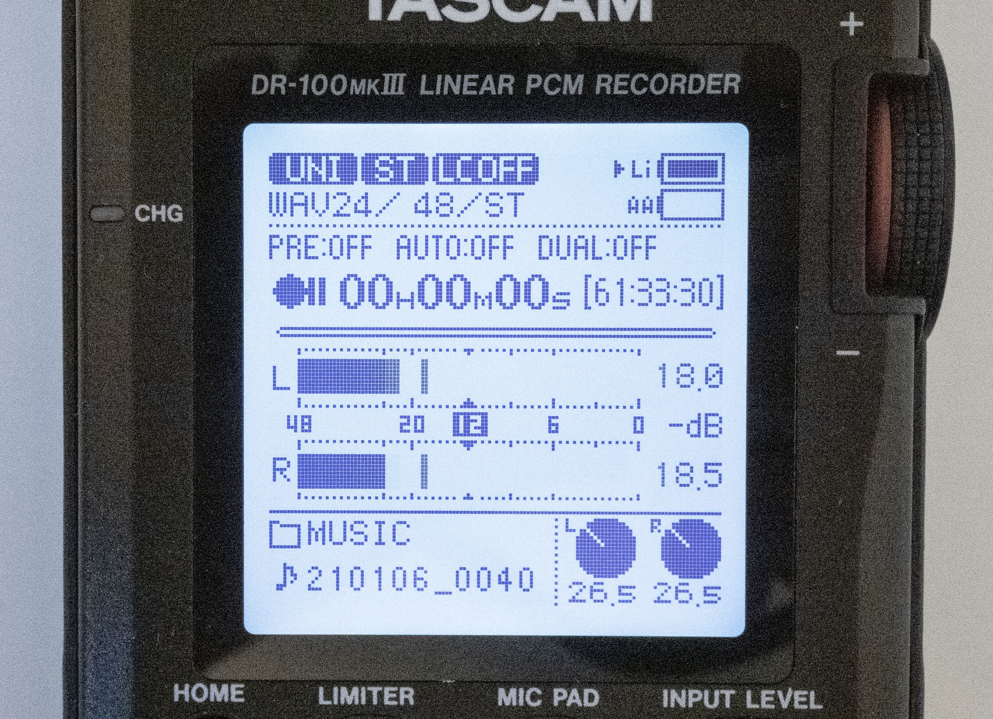 The screen is fantastic. It's a low-tech reflective LCD, which is great, as it uses minimal power, and is easy to read outdoors in bright daylight. The main thing is that its large size makes the meters very easy to read; they even have numeric dB markings below the scales. There's a lot of information on that screen, but this is generally good, as it lets you check your settings at a glance. This includes the two "virtual level knobs" showing your level settings.