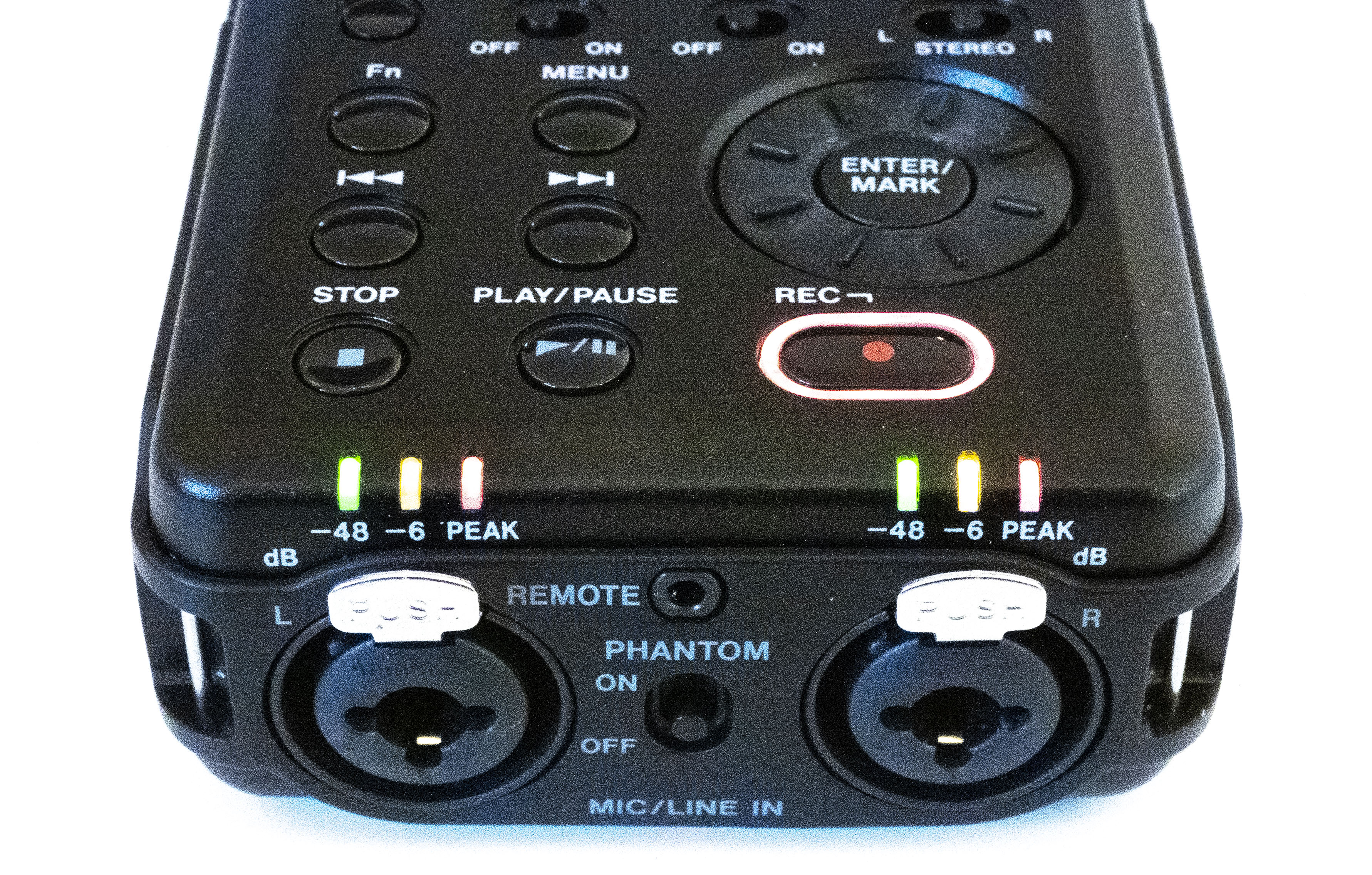 One nice feature is the inclusion of two sets of level LEDs, one for each channel. These are in addition to the level meters on the display, and give you a simple 3-stage level indication for each of the two channels, the highest level being clipping (or nearly so). This is too minimal for real level-setting, but a big step above a simple "peak" LED.