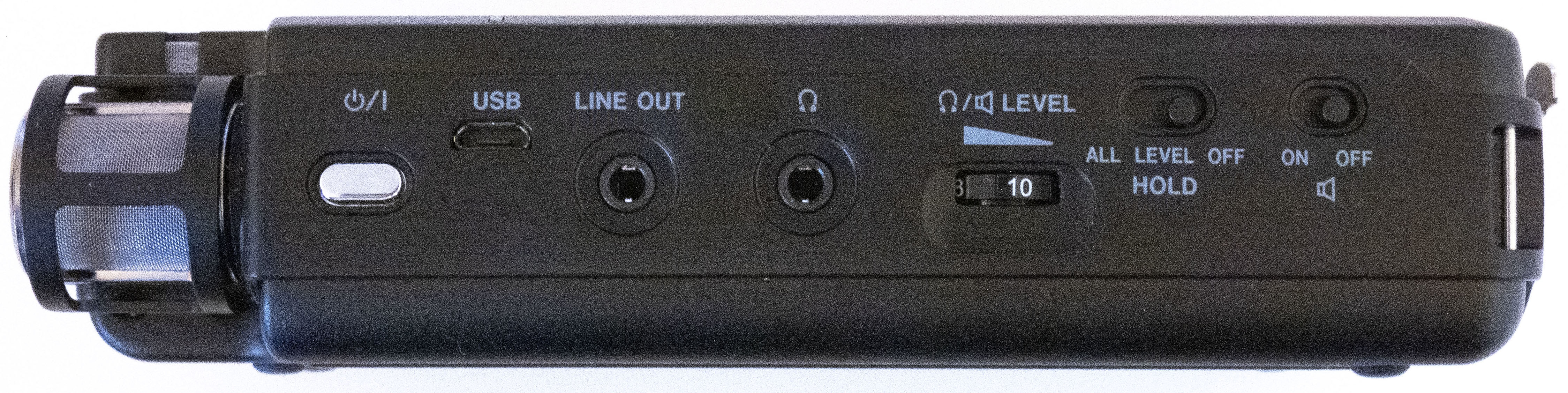 The 3.5mm mic in and digital inputs are on the top end, between the mics. The power switch is a press-and-hold button on the left side. The headphone volume is a typical edge-wheel; a "hold" switch beside it lets you lock the levels, or all the controls. The line out (3.5mm) and headphone jacks are on the same side.