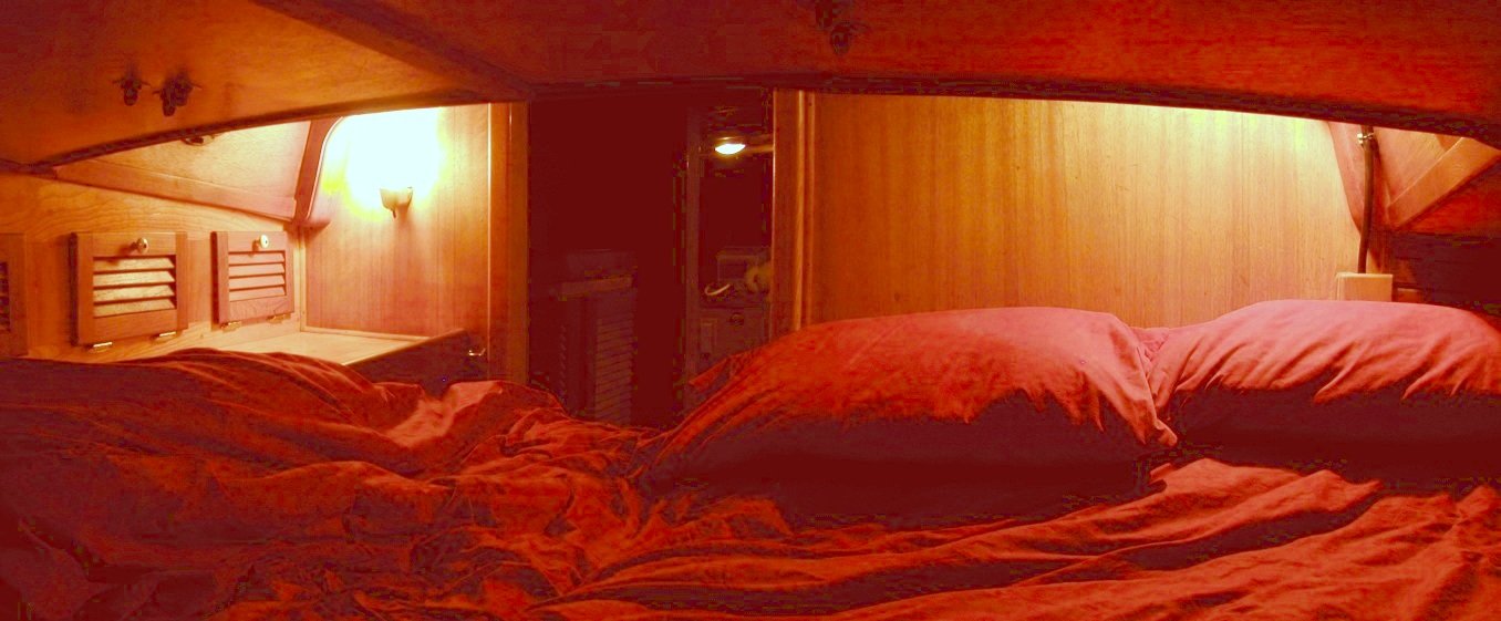 Stateroom, looking aft A panoramic view from the extreme forepeak of the boat; ample storage to starboard (left here), and the sail lockers are under the bed. A passageway leads back into the salon, with the head on the right.