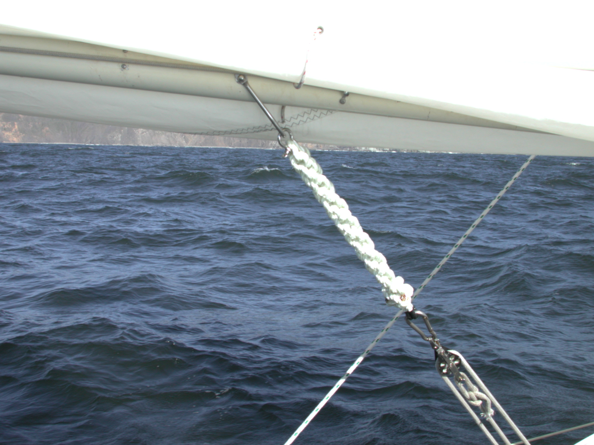 The preventer/vang I don't have a normal vang (boom downhaul), which would normally run from the boom to the base of the mast, because the dinghy is in the way. Instead, each time I tack I rig a tackle from the bail on the boom down to either the port or starboard chainplates -- it's not nearly as much hassle as it sounds. The big rope thing is a crown sinnet made of nylon, to act as a shock absorber. Sailing to Pillar Point