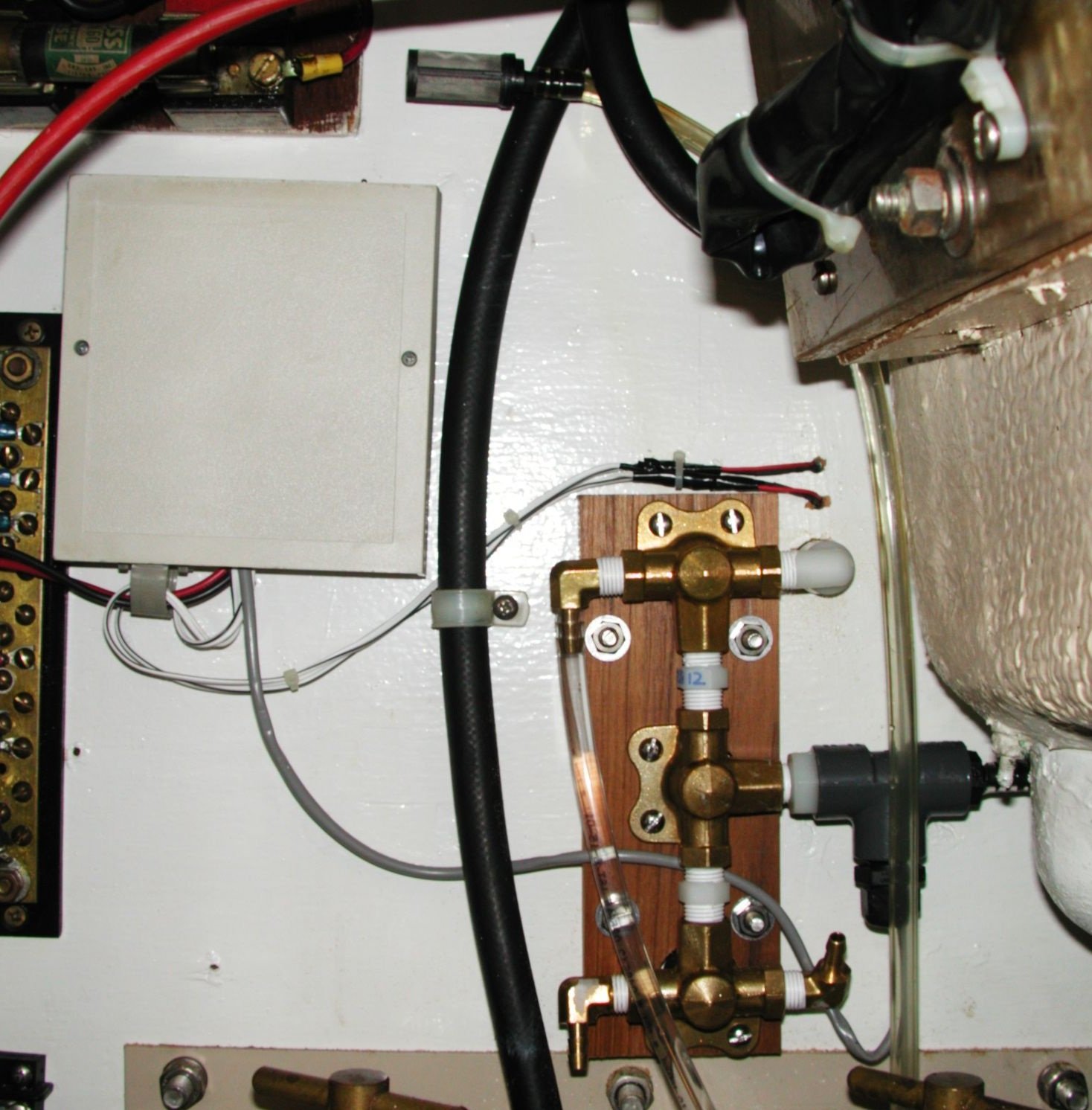The watermaker output manifold The watermaker output manifold installation, as seen from the engine room. The water comes in to the T-fitting on the right, past the salinity detector; the upper outputs are to the bilge and test spigot; the lower outputs will be connected to the forward and aft water tanks. The salinity monitor electronics are in the box on the upper-left; the power and salinity LEDs poke through from the quarter-berth on the upper-right. The clear tube coming up to a little strainer at the top is the alternate watermaker input, for cleaning. The black hose coming down the middle is the fuel line; the filters are below.