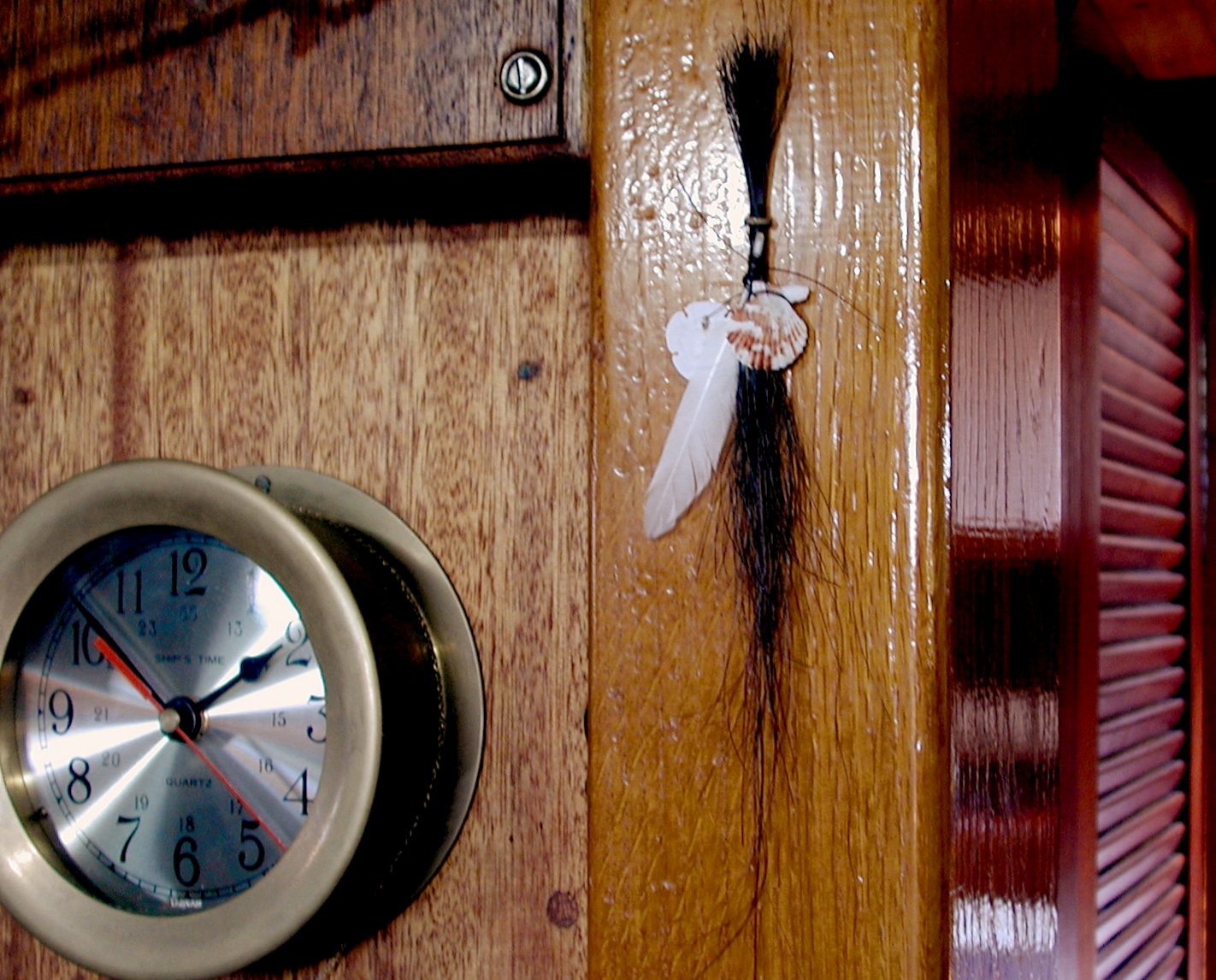 A spirit chaser (a Native American good luck charm) made for Moonrise by Lisa. The horsehair is from her horse, Critter. This has pride of place in the main cabin, on the compression post -- the massive beam that transmits the driving force from the mast to the hull.