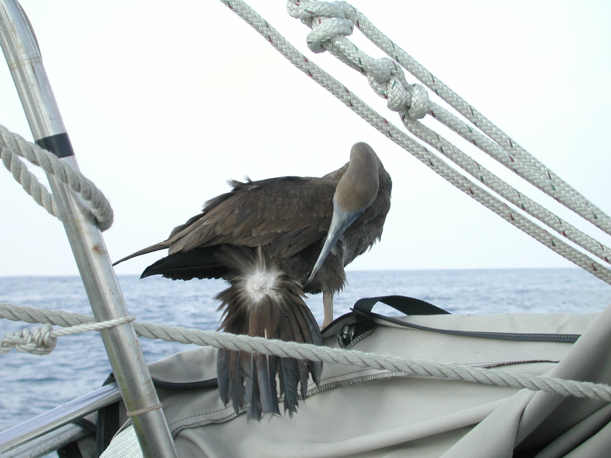 Our passenger, preening (brown booby). Another bird that took up residence for several hours, to rest and preen.